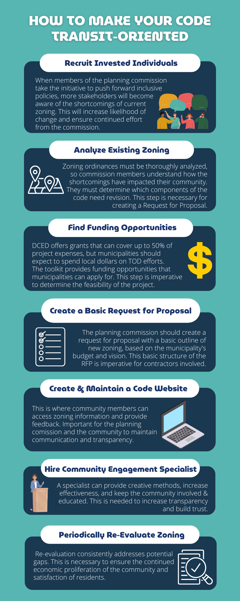 Municipalities often highlight prominent transit-related issues they face but lack the expertise to execute the changes they would like to observe within their communities. The Transportation Improvement Seminar Series (TISS) provides municipal leaders and representatives with tools to facilitate the implementation of TOD through educational and applied learning exercises.